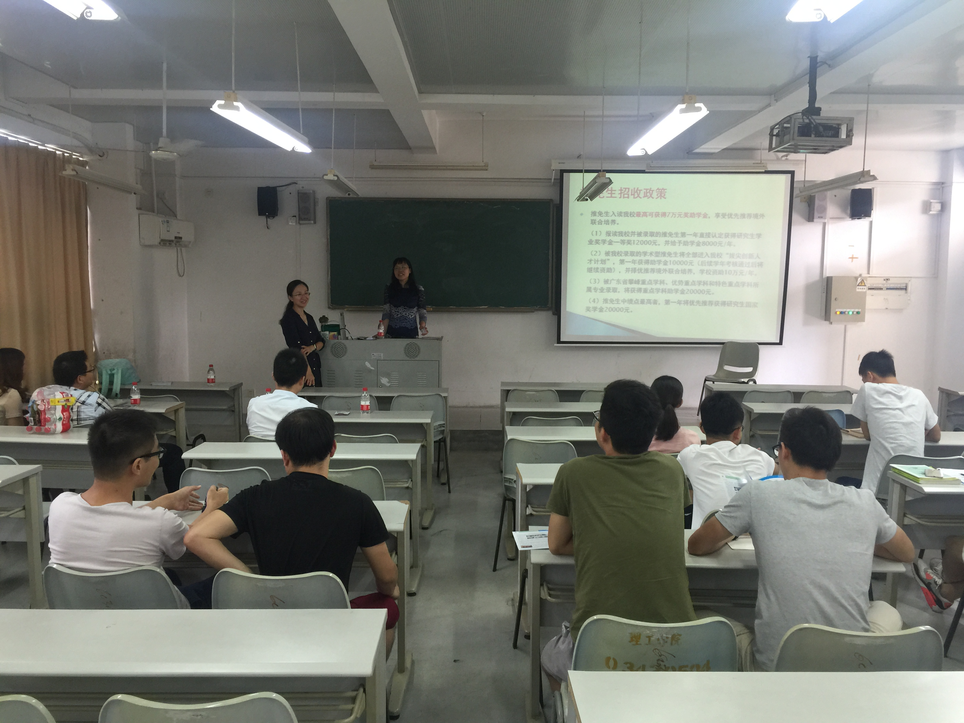 2017年9月26日上午10点,广东工业大学轻工化工学院院长助理郑育英教授和研究生办公室马巍老师在我校研究生办公室工作人员陪同下,来到教学楼6C302为好色tv 的考研学子展开招生宣讲。