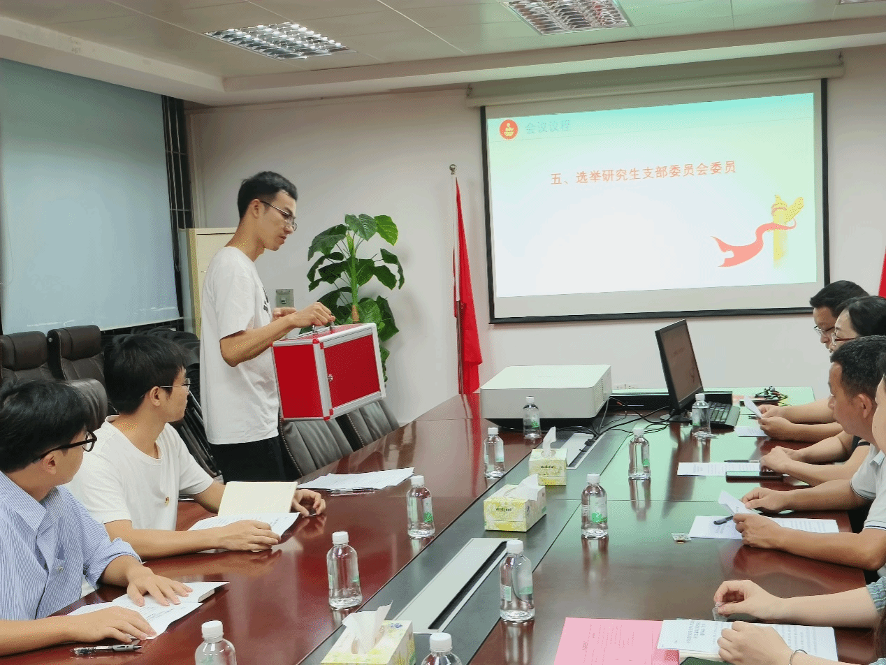 会议严格按照民主选举程序,通过了选举办法(草案)、候选人预备人选、以及监票人和计票人名单,采用无记名投票方式,差额选举产生新一届委员。经投票选举,康世民、黄千恩、谢尚芳当选为研究生支部委员会委员。经支部委员会选举,康世民当选为支部书记,黄千恩当选为支部组织委员兼纪检委员,谢尚芳当选为支部宣传委员。