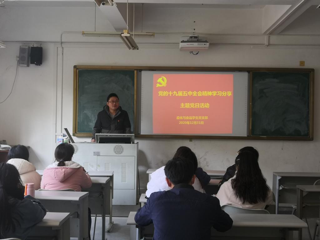 应化与食品学生党支部于教学楼6b301开展“党的十九届五中全会精神学习分享”主题党日活动。应化与食品学生党支部书记张博作学习分享,支部党员参加此次活动。