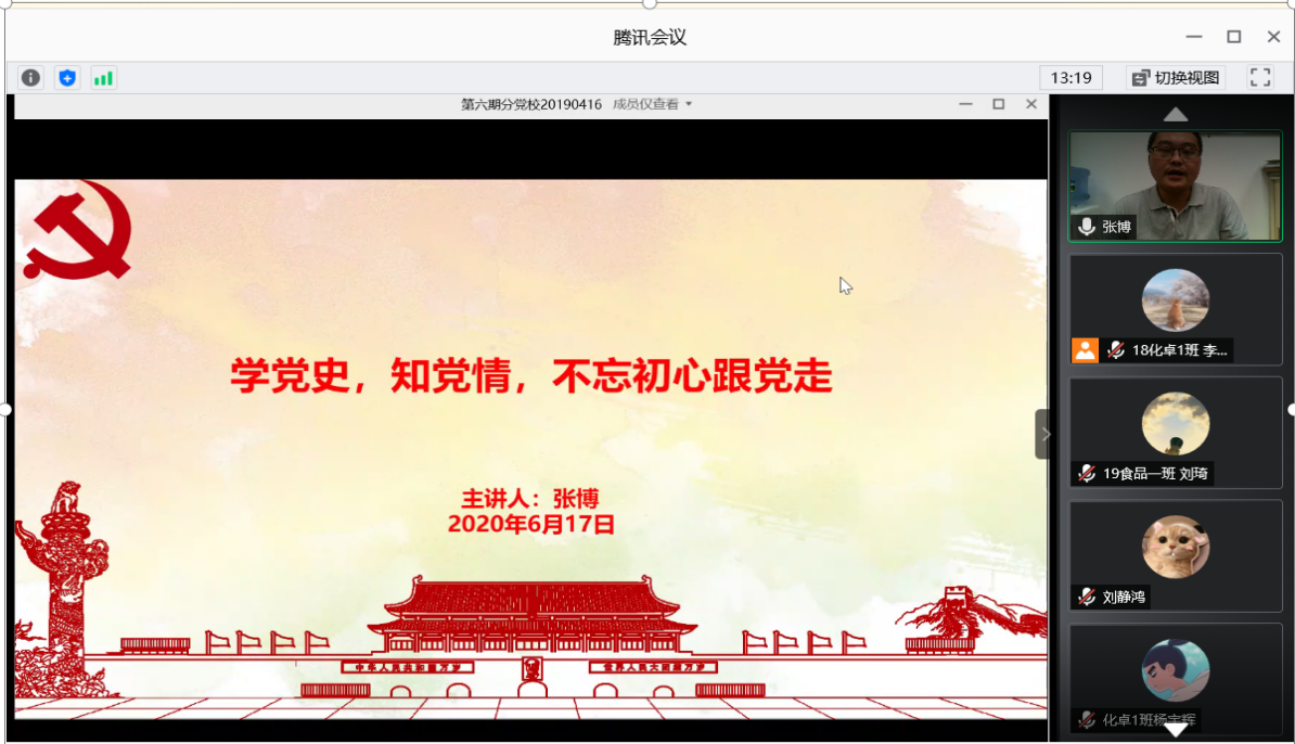 2020年6月17日,好色tv 应化与食品学生支部书记张博通过腾讯会议形式为支部党员和入党积极分子讲授“学党史,知党情,不忘初心跟党走”主题党课。