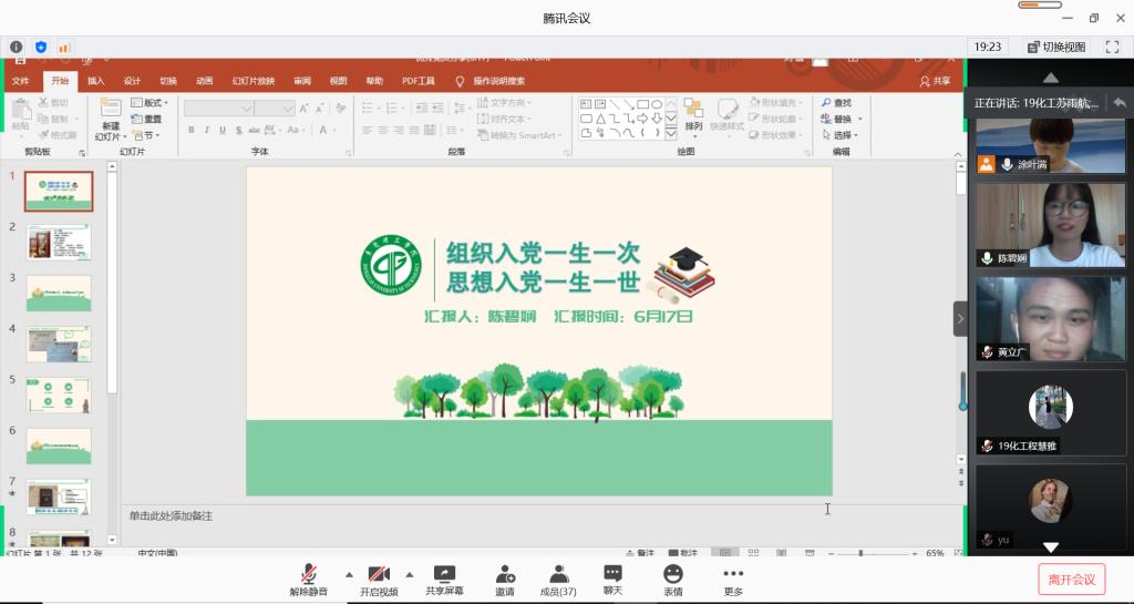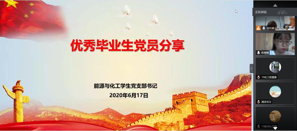 能源与化工学生党支部在腾讯会议上举行了优秀毕业生党员分享会。会上邀请了2020届优秀毕业生党员陈碧娴及黄立广,为第八期34名入党积极分子分享大学四年的奋斗足迹,会议由党支部书记涂叶满主持。