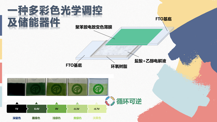 本项目采用电化学沉积法进行聚苯胺电致变色薄膜的制备,通过优化电化学沉积工艺,提升了薄膜的循环稳定性。在对聚苯胺薄膜施加-1V-1V电压时,薄膜呈现出多彩色调控特性深蓝色(1V),墨绿色(0.4V),浅绿色(0V),黄绿色(-0.3V),浅黄色(-0.7V)。基于该材料制备的器件不仅可呈现多彩色显示,且具有能量储存特性(可使LED灯泡发光),在驱动小型家用电器方面具有应用潜力。