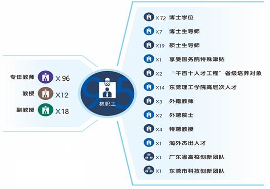 学院师资力量雄厚,现有教职工96人,具有博士学位72人,正副教授30人,另有双聘院士1人、特聘教授4人。建设有国家中拉清洁能源与气候变化联合实验室东莞基地,广东省分布式能源系统重点实验室、广东省高校创新团队、东莞市科技创新团队、省级工程技术研究中心、省级实验教学示范中心、东莞市重点实验室以及45个大学生校外实习基地。学院近年承担了国家十三五重点研发计划项目、国家自然科学基金项目等一批高层次科研项目,科研经费总额9000多万元。学院积极面向国家和广东省港珠澳大湾区区域经济建设发展需求,开展科学研究与技术服务,与国内高校、科研院所开展了紧密的学研合作,成果丰硕,为促进科技成果转化和地方经济建设的快速发展起到了积极作用。
