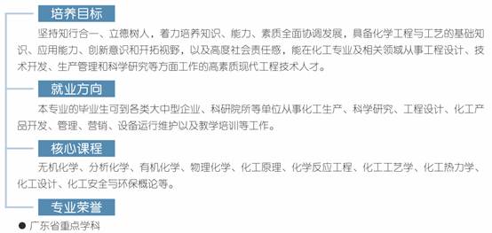 毕业生就业于珠三角优质企业(部分),包括:华为、中兴通讯、约克(美国)、茂名石化、国电电力投资集团、粤电集团、生益科技,大宝化工、格力、美的、松下、宝洁、联合利华、陶氏化学、中石化、立白、玛氏箭牌,中国储备粮管理集团有限公司。