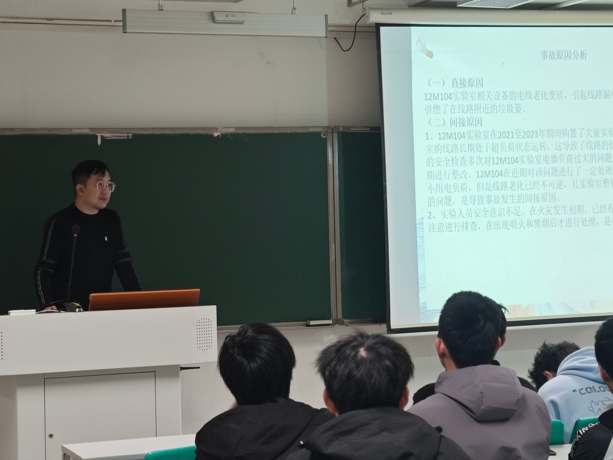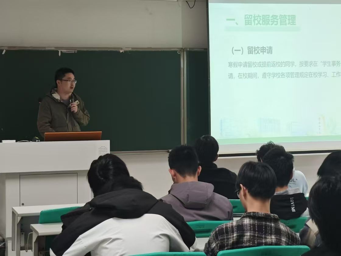 张博老师传达了学校寒假期间学生管理相关要求,重点围绕学生社区安全、实验室安全、交通安全、防范网络诈骗、心理健康等进行了工作提醒。