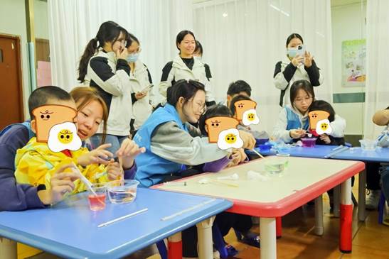 “哇,水变红了!”在小雨点儿童潜能开发中心的教室里,一名自闭症男孩盯着试管中因酚酞试剂而瞬间变色的碱性溶液,兴奋地拍着小手。这一幕发生在2024年9月26日的“变色小实验”课堂上。小雨点志愿服务队的志愿者们通过酸碱反应、泡泡水制作等趣味实验,将晦涩的化学知识转化为孩子们眼中“会说话的魔法”。