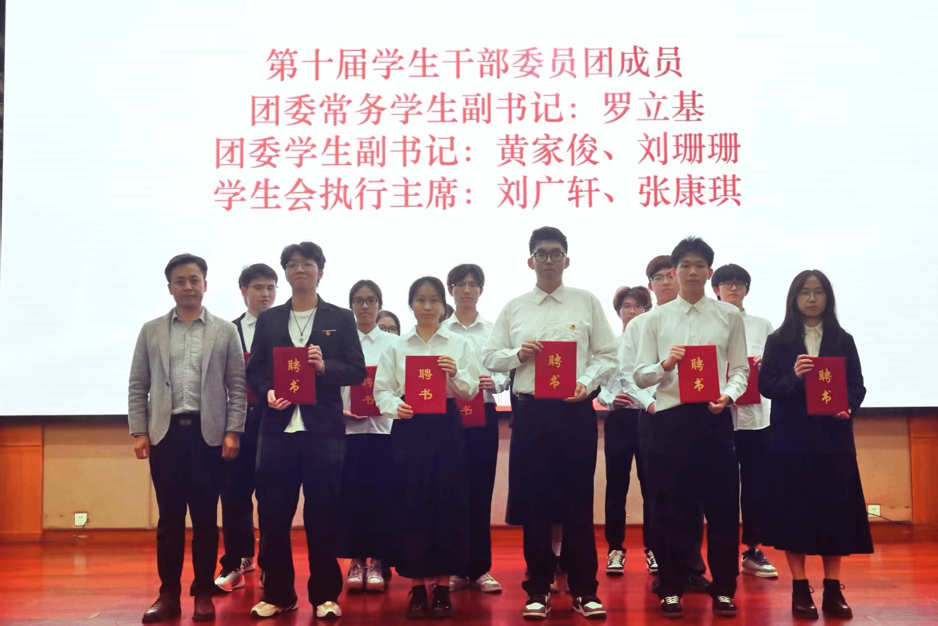 会上,杨方副书记为第十届团委、学生会主席团成员颁发聘书。黄千恩老师宣读了第九届团委、学生会优秀部门名单,刘哲老师为获奖部门颁发证书。学生会秘书长王馨老师宣读第十届团委、学生会新任学生干部名单,王馨老师、黄千恩老师分别为新任学生干部颁发聘书。在学生会执行主席刘广轩领誓下,第十届团委、学生会新任学生干部庄严宣誓就职。