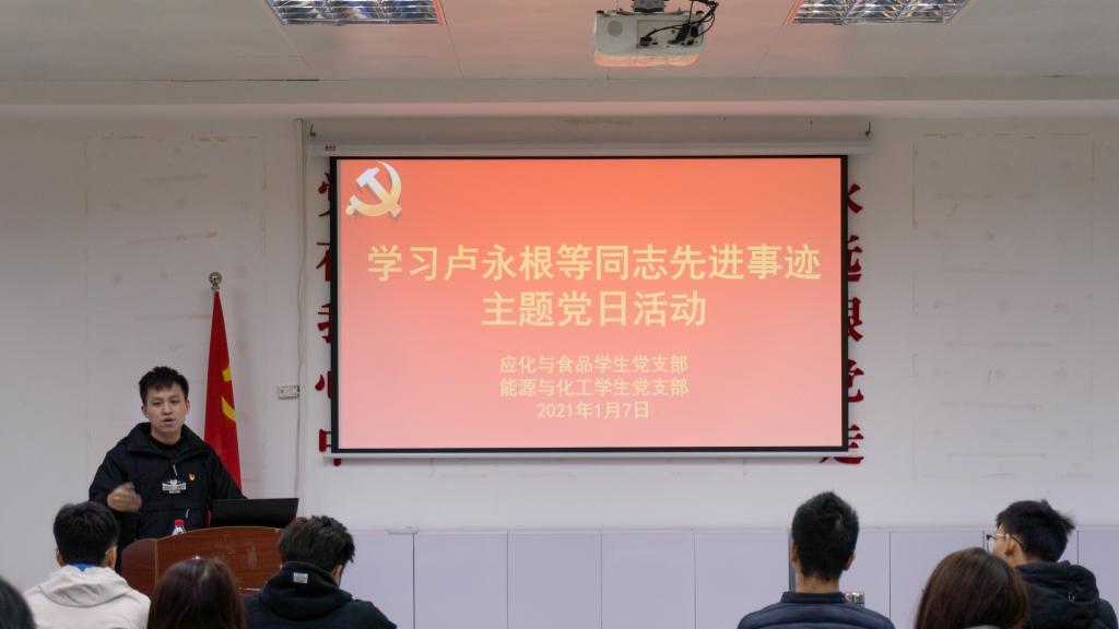 2021年1月7日下午,好色tv 应化与食品学生党支部、能源与化工学生党支部联合开展“学习卢永根等同志先进事迹”主题党日活动。辅导员曾祥龙老师和支部党员参加此次活动,活动由应化与食品学生党支部书记张博主持。