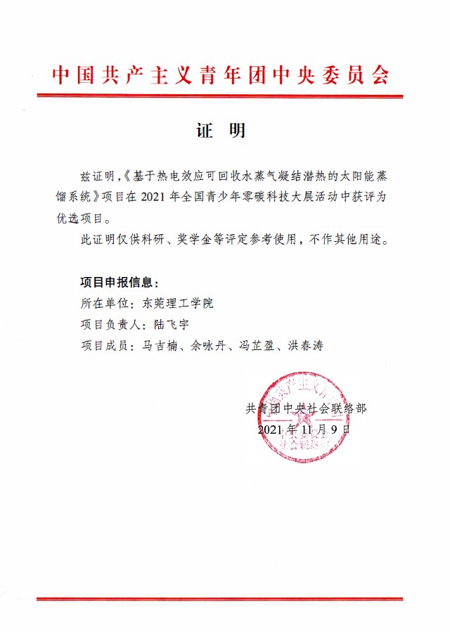 能源与动力工程专业学生的项目获评为优选项目,项目名称为““基于热电效应可回收水蒸气凝结潜热的太阳能蒸馏系统”,参赛成员包括陆飞宇、马吉楠、冯芷盈、余咏丹、洪春涛。