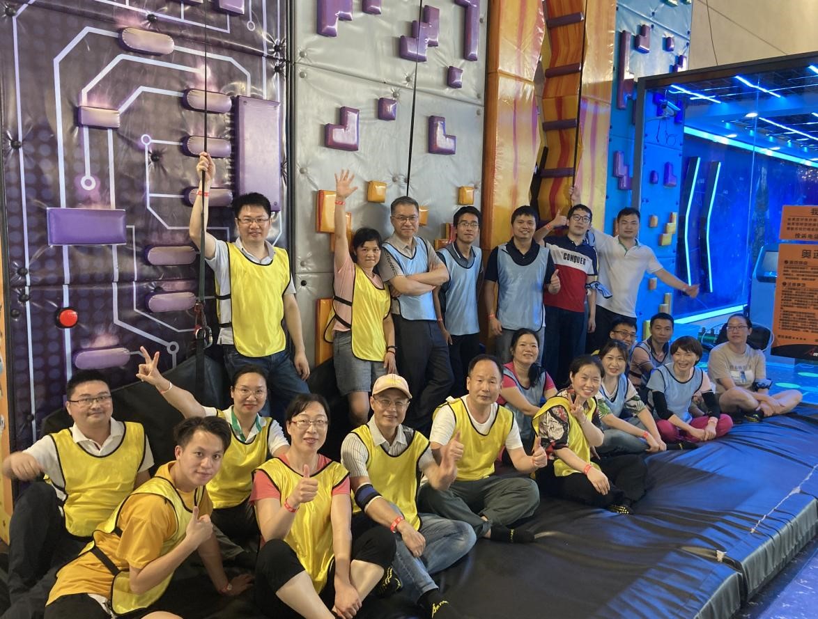 教职工分为两队,各队着不同颜色的队服,凝聚力迅速凸显,在短时间内团结协作,设计队名及口号,在舞台前面姿态昂扬展现了各队团队精神风采;随后,在教练的指导下进行了同心协力、勇攀高峰、海绵对战三个项目的团建对抗活动,每位教职工都积极参与,集思广益,相互合作,充满激情,运用集体的智慧共同完成了所有项目;在对抗环节结束以后,老师们自由体验了场馆内包括雪橇滑梯、高空攀爬架、信念之跃、大峡谷滑梯、飞狐塔、漂移车场等在内的30余项目,老师们仿佛回到的少年时期,玩的不亦乐乎。