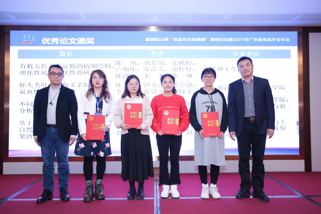 学术报告环节结束后,阮征秘书长代表学会专家委员会宣布2021年广东省食品学会年会学术论文评审结果,共有14篇论文获得优秀奖,我校陈旭博士等提交的论文《有机五色小米淀粉的精细结构、理化性质和消化性的研究》获得了优秀论文奖。省学会领导、企业家代表为优秀论文作者代表颁发了荣誉证书。优秀论文奖是广东省食品学会科学技术奖奖项之一,已经获广东省科学技术奖评审委员会办公室批准备案。