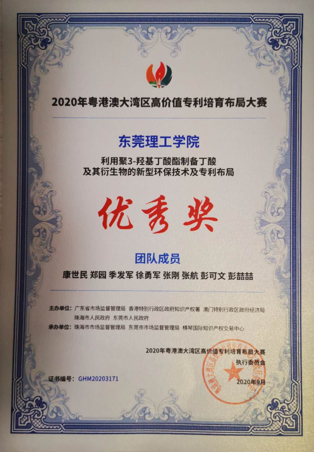 大赛由广东省市场监督管理局、香港知识产权署、澳门经济局、珠海市政府、东莞市政府联合举办。项目涵盖新一代信息技术、高端装备制造、绿色低碳、生物医药、数字经济领域、新材料、海洋经济、现代农业八大领域。大赛决出金奖2名、银奖8名、优秀奖20名、最佳分析评议奖2名和最具投资潜力奖6名。我校项目是初创组绿色低碳领域唯一进入50强,并最终获奖的项目;也是本次比赛东莞市仅有的两个获奖项目之一(另一个获奖单位为广东东阳光药业有限公司)。此外,另有4所省内知名高校(华南理工大学,中山大学,广东工业大学和华南农业大学)和2所港澳高校(香港浸会大学,澳门大学)在本次大赛中获奖。