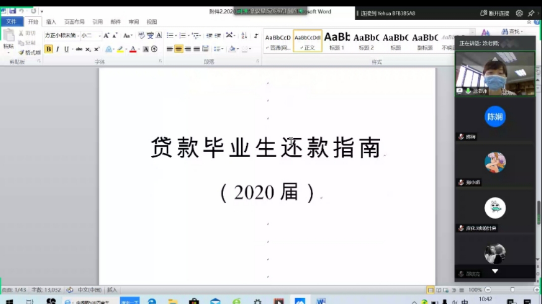 政治辅导员涂叶满主持,目的是对2020届毕业生进行诚信教育与介绍国家助学贷款的还款流程及注意事项。21位申请了国家助学贷款的2020届毕业生分别通过线上直播平台和线下的形式参加了本次会议。