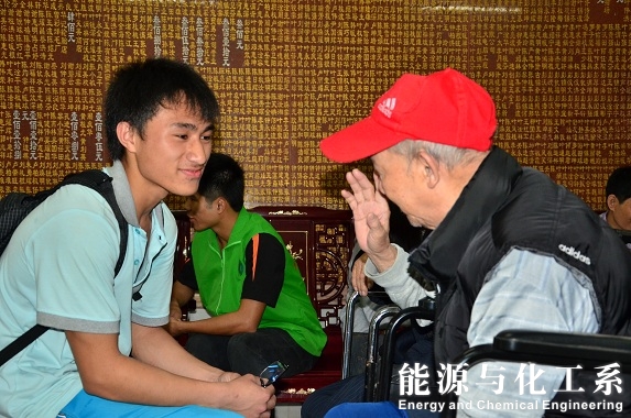 在分工之后,各位同学就去和老人们聊天,倾听他们的历史,并在聊天时,班级送上买好的水果并削给他们吃。同学们都很有孝心,不但耐心地听完老人们的故事,并且问了老人们现今的生活状况。在与老人聊天的同时,医生和护士们也在忙着为老人检查身体。测视力是最开心的一件事,护士和同学们都在为视力好的老人叫好,老人们都不甘示弱,都能赢得大家的掌声。聊天中,虽然有些老人因为岁数大听不见,但是他们看到同学们就开心。同学们表演唱歌和吹口琴,然后是全班合唱“万水千山总是情”,并向老人们献上之前在学校收集的祝福语,老人们都聊得很开心,院长也希望这样的志愿者再来。最后,12化工全班合影留念,告别老人们和院长。