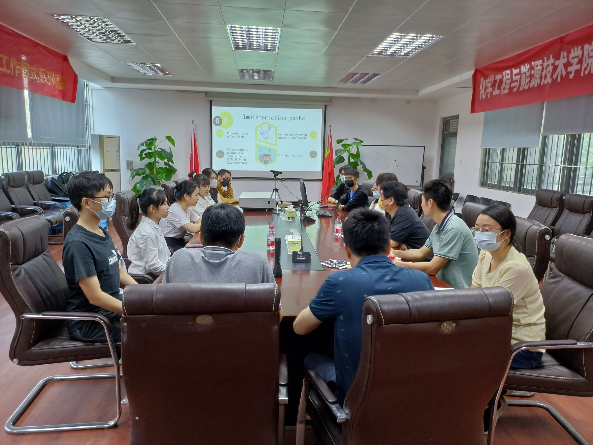四个系不同专业和不同年级学生。赛前,参赛学生认真准备“碳达峰与碳中和”主题的全英文PPT。活动当天,交流研讨会采用全英文的模式进行,参赛学生逐一展示自己的设计。参赛学生的设计基于自身专业所学知识,查阅相关文献,并增加个人独到见解进行全英演讲。学生演讲完毕后,五位评委老师根据学生设计的PPT和汇报进行提问,师生现场互动轻松活跃,营造出浓厚的国际化交流氛围,更是有效提高学生的英语口语表达能力和上台演讲能力。