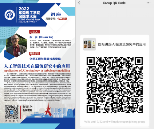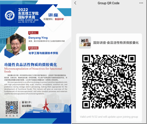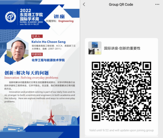 刘宇佳博士、洪南龙博士、陈佰满博士和何奎博士,涉及领域广泛,包括化工、环境、能源、食品和工程创新等相关内容,主要采用线上授课方式。以下是四门国际讲座的海报和预报名微信群,请感兴趣的同学加入微信群,向老师了解具体讲座信息,包括讲座的时间、授课方式和具体内容等。