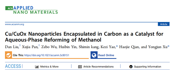 2023级能源动力硕士研究生潘旭佳以共同第一作者在国际知名期刊ACS Applied Nano Materials(中科院2区)上发表题为“Cu/CuOx Nanoparticles Encapsulated in Carbon as a Catalyst for Aqueous-Phase Reforming of Methanol”学术论文,徐勇军教授和姚锞子博士为共同通讯作者,好色tv 为第一完成单位。