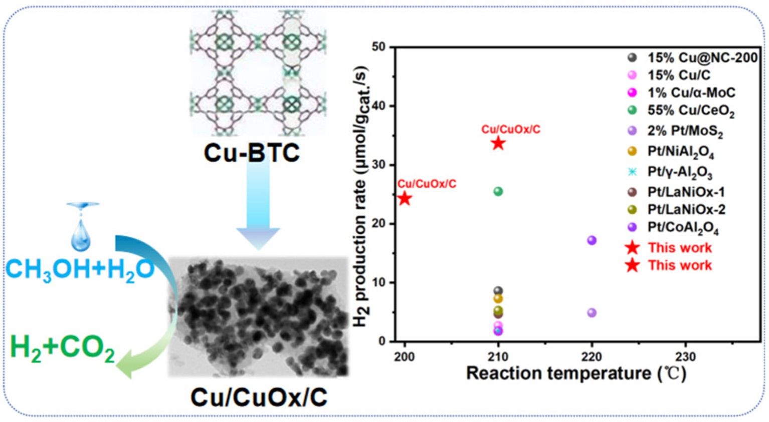 研究团队通过设计并合成了一种将Cu/CuOx纳米颗粒封装在碳基质中的甲醇制氢催化剂(Cu/CuOx/C),其在210 °C时表现出33.7 μmol·gcat-1·s-1的优异产氢速率,明显优于多数同类催化剂。机理研究表明,Cu/CuOx/C催化剂优异的稳定性可归因于保护性碳涂层的存在,它增强了Cu/CuOx NPs与载体之间的相互作用,并抑制了铜纳米颗粒的聚集。通过XRD和ICP-OES分析对重复使用的催化剂进行了考察,结果表明Cu-CuOx/C催化剂的结构完整性得到了很大程度的保留。该研究为助力解决传统铜基催化剂中催化剂效率低、稳定性差的问题提供了开发高效、稳定的非贵金属催化剂新思路,对推动甲醇液相重整技术的工业化应用具有重要意义。